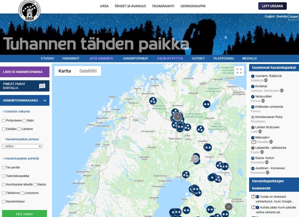 – Pimeät havaintopaikat: https://www.taivaanvahti.fi/locations/browse/map