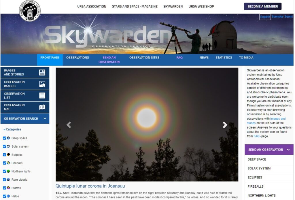 Taivaanvahtiin saapui viime vuonna uusi ominaisuus. Havainnot voi nyt kääntää vapaasti suomen- ruotsin- ja englanninkielen välillä. Saimme haastateltavaksemme Emma Bruusin, henkilön Taivaanvahdin takana. Hänen ansiotaan on myös pitkälti tämä uusi päivitys.