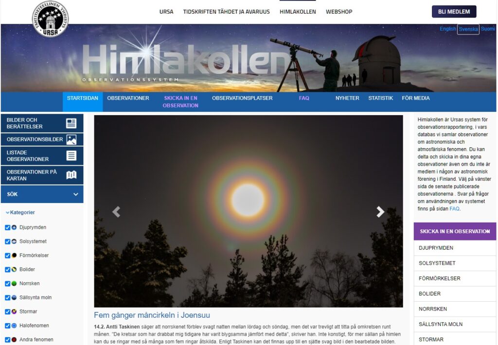Revontulihavaintoja on iloksemme saapunut myös Ruotsista. Emme juurikaan ole vielä mainostaneet Taivaanvahdin olemassaoloa Suomen ulkopuolella. Käyttäjät muualta Pohjoismaista ovat kuitenkin kovasti tervetulleita juuri yhdessä seurattavien taivaanilmiöiden vuoksi. Näen kaikenlaisen kulttuurijaon ja lähentymisen muiden Pohjoismaiden kanssa erittäin tervetulleena kehityskulkuna.