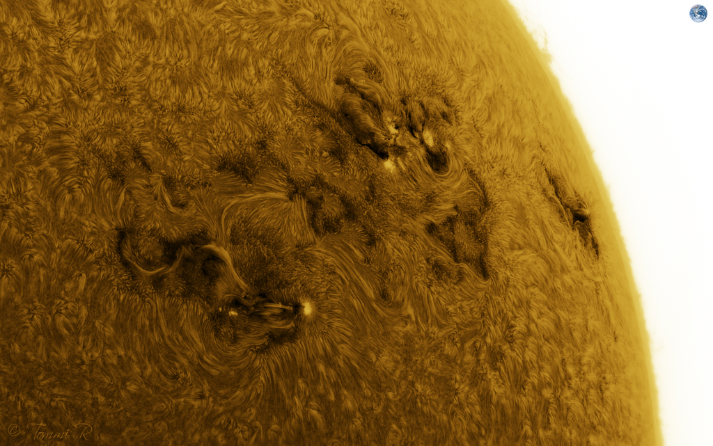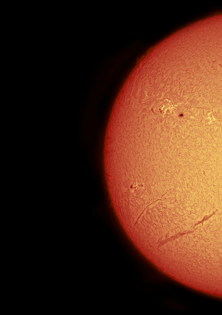 Auringossa olisi nyt taas makeaa mahan täydeltä auringonpilkkujen, suuren filamentin ja useamman reunalla näkyvän purkauksen myötä. Aurinko oli jo hyvää matkaa menossa mailleen tai ainakin puiden taakse, jonka vuoksi koko kiekkoa ei ehtinyt kuvaamaan.