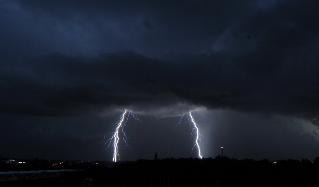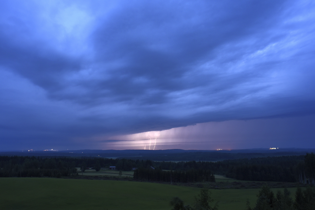 Noin tunnin päästä alkoi kuulua melkein yhtämittaista jylyä kaukaa lännestä, varmuudella ainakin yli 70 km päästä. Tasan puolelta öin sainkin ensimmäisen salaman kuvattua. Sen etäisyys minusta oli jotain 50 ja 100 km väliltä – äänen perusteella ei voinut laskea, koska jylinää kuului yhtenään. Seuraavien 2,5 tunnin ajan sain ihailla komeinta ukkosnäytelmää aikoihin. Vyörypilvi saapui kohdalle puoli yhdeltä.