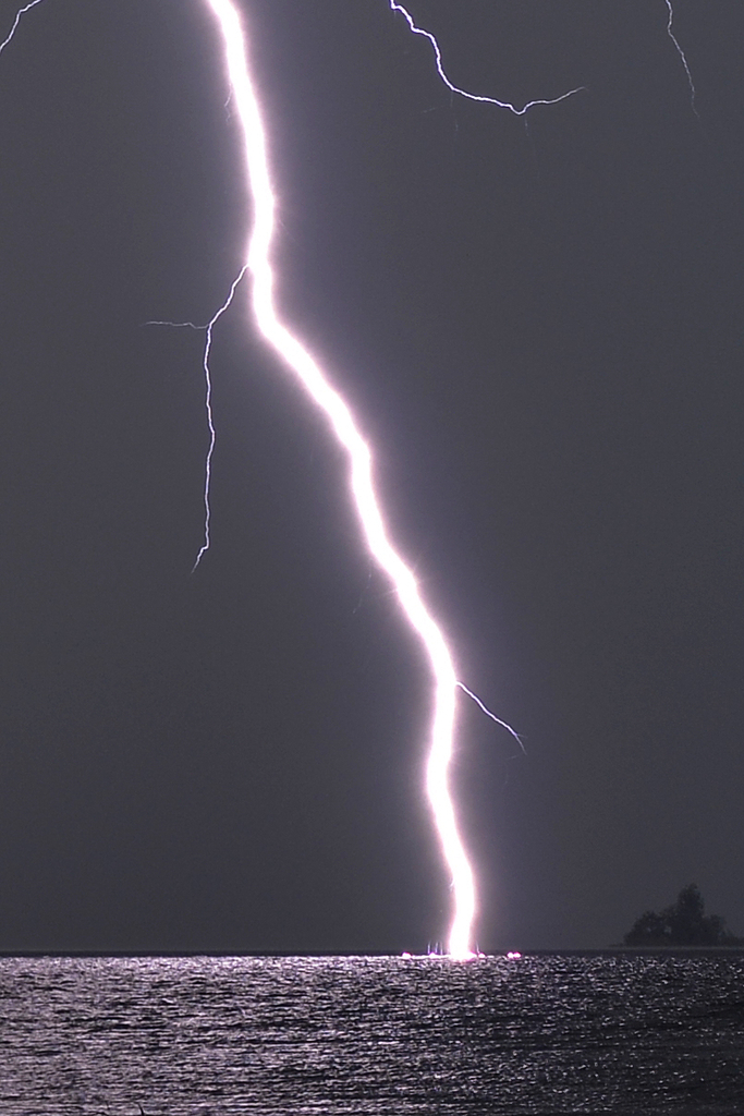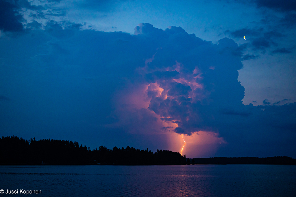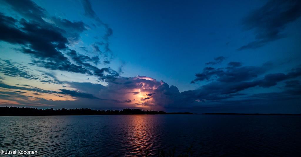 Helteinen ilmamassa sopivan instabiilisuuden ja pimenevän illan ansiosta tarjosi leiskunnan, jota on hankala laittaa enään paremmaksi. Pielistä pitkin saapunut tulenjakaja kulki suoraan avoimessa maisemassa väläyttäen salamoita sekunnin parin välein. Osa iskuista osui etualalla olevaan vesistöön ja vielä suurempi osa sivuille kuvaussektorin kummallekin puolelle. Tällainen valojen ja pimeän kesäyön uskomaton näytelmä tuskin ihan heti unohtuu. Alla joitakin kuvia lähelle iskeneistä salamoista. Kuvat Nurmeksen satamasta. EDIT: vitoskuvassa ja kutoskuvassa kroppaus. Kuvissa näkyy salaman ympärillä veden pinnassa vastaesisalamoita kirkkaina valkoisen ja pinkin sävyisinä neulasmaisina muodostelmina.