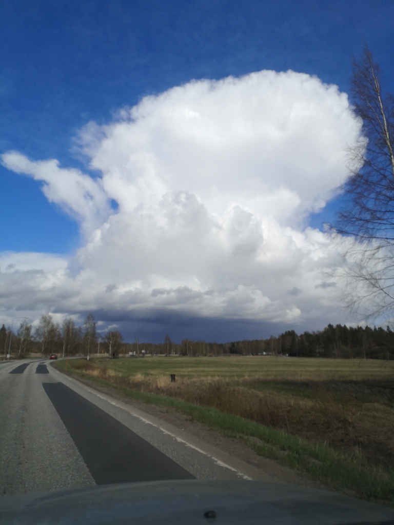 Hetken odottelin ja hiukan jo harmittelin. Pilvi näytti taas hiljenneen. Mutta sitten. KraBomm… Selän takaa kuului komea räsähdys. Raision suunnalle olikin noussut tuore ukkossolu, joka näytti olevan ärhäkkä. Sitä kohti siis.