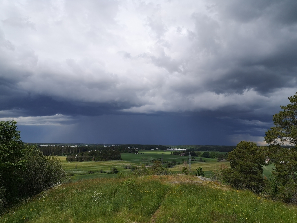 Puuskuttaen kapusin kallion laelle, laitoin jalustan pystyyn ja suuntasin kameran kohti Raision suuntaa. Sieltä oli saapumassa todella nätti, musta sadeseinä. Kaukaista jyrinää kantautui korviini. Ja sitten, salama. Kohta toinenkin. Kaunista. Linnut lauloivat, aurinko lämmitti ja kukat tuoksuivat. Ukkospilvi kumisi. Voiko parempaa kesäpäivää toivoa?
