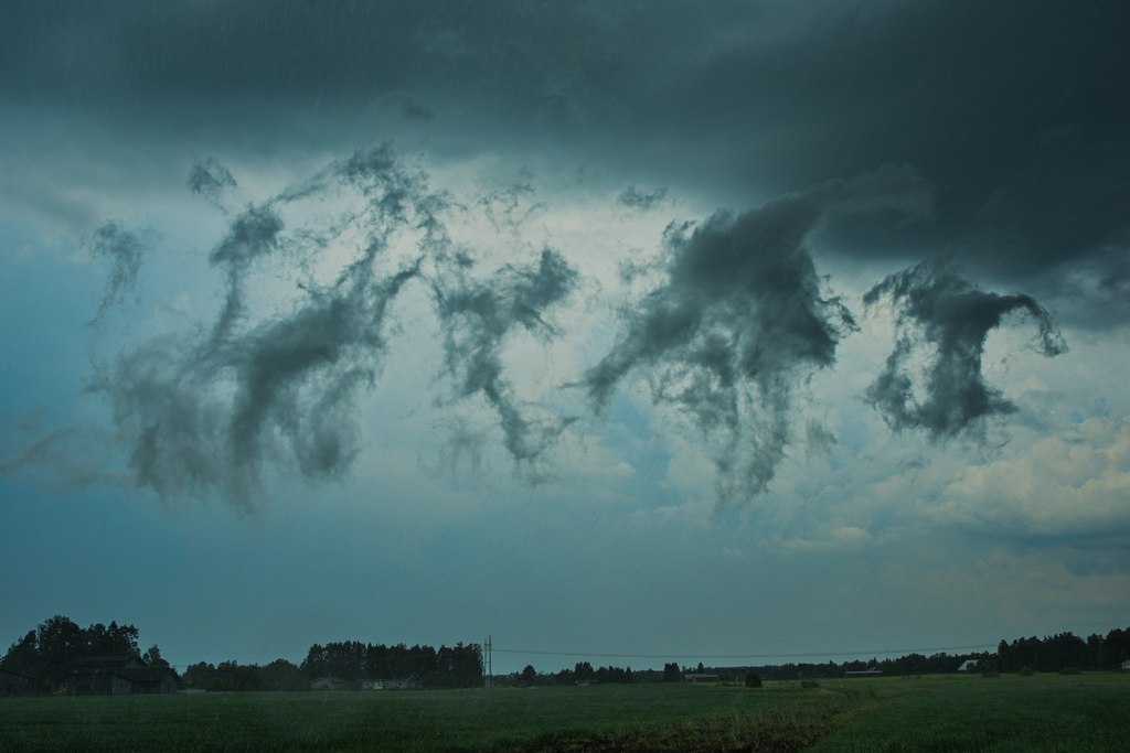 Istuin autossa ja katselin, kun sade alkoi piiskaamaan ympärilläni. Erikoiset pilvimuodostelmat kulkivat syöksyn edessä. Päätin lähteä kotia kohti.