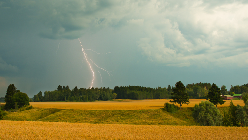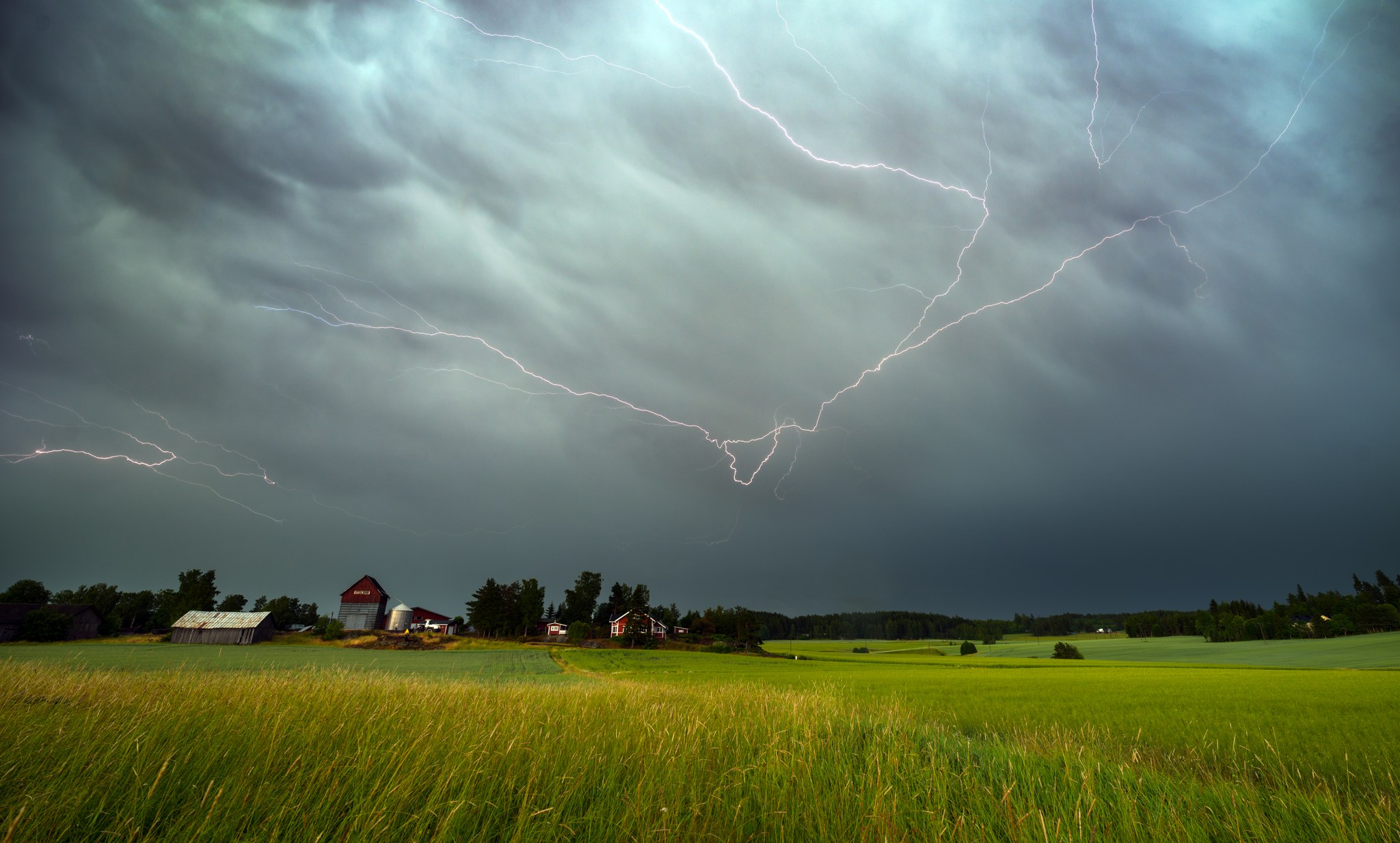 Kun kovin sade oli menossa ohi, ajoin niityn reunaan, josta oli hyvä näkymä kohti itää. Komeaa katseltavaa, kun pilvisalamat halkoivat lähes koko taivaan laajuudelta. Laitoin 14mm laajakulman kiinni, joka sekin oli hiukan liian kapea näille sähköseiteille.