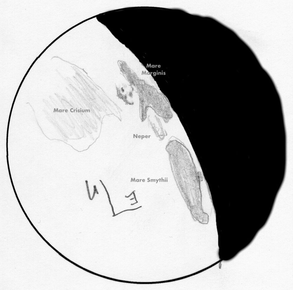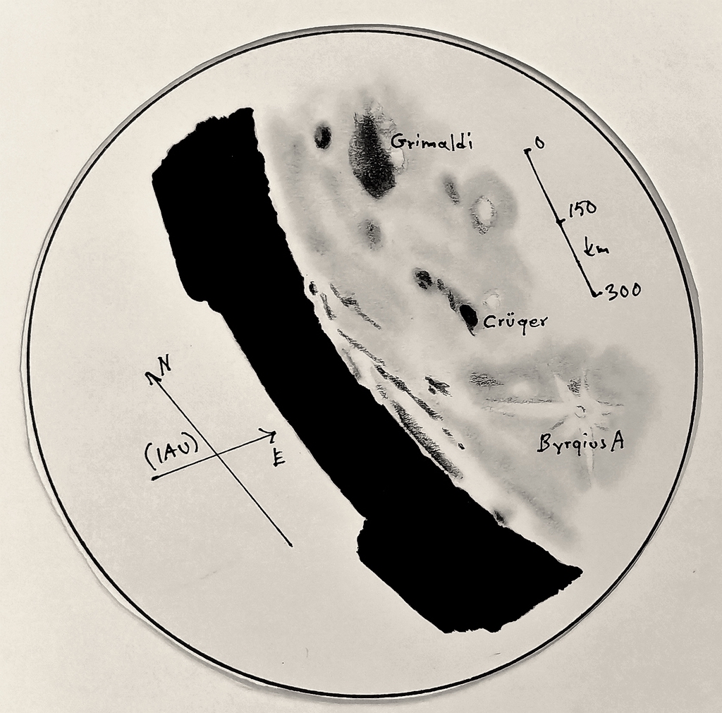 - Kuva 4. Mare Marginis ja Mare Smythii 10.1.2022 kello 16.30–16.45. Maret sijaitsevat Kuun itäisellä libraatiovyöhykkeellä. Libraatio oli yli 6°, jolloin saattoi nähdä jopa näiden merien vastarannat. M127/1500, 150×. Piirros: Paula Wirtanen.