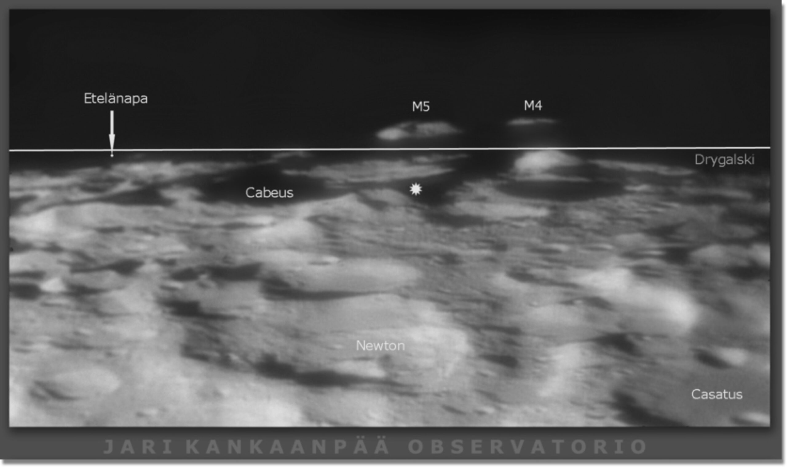 Kuva 10. Kuun etelänavan ympäristöä 8./9.4.2020 kello 23.15–0.45. Kuvaan merkityt huiput M4 ja M5 ovat Kuun etäpuolen maisemia. Cabeus-kraatterissa on tähdellä merkitty kohta, josta LCROSS-luotaimen törmääjän nostamasta pölypilvestä varmistui veden läsnäolo Kuun etelänavan syvissä kraattereissa. Kuvassa etelä on ylhäällä. Kuva: Jari Kankaanpää.