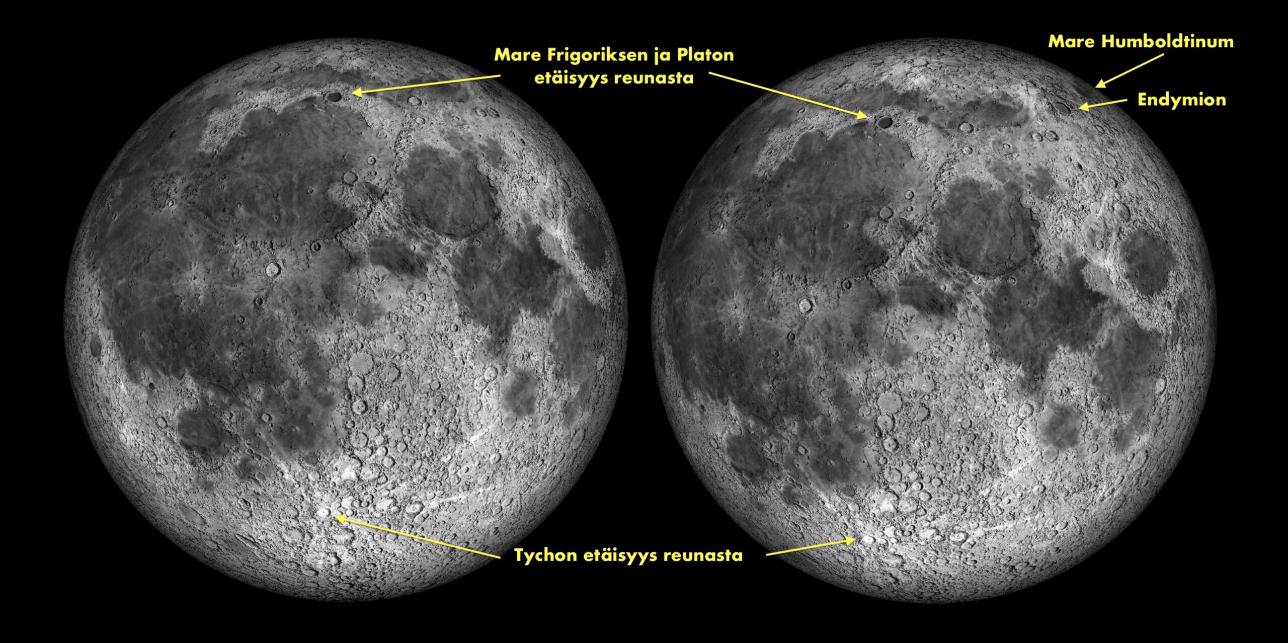 Kannattaa myös tarkastella Kuun koillisreunalla olevan Endymion-kraatterin ympäristöä. Endymionin voi nähdä libraatiosta riippumatta, mutta pohjoisen libraation aikaan sen takana erottuu Mare Humboldtianum (Humboldtin meri). Tällöin alueella näkyy kaksi tummapohjaista kohdetta.