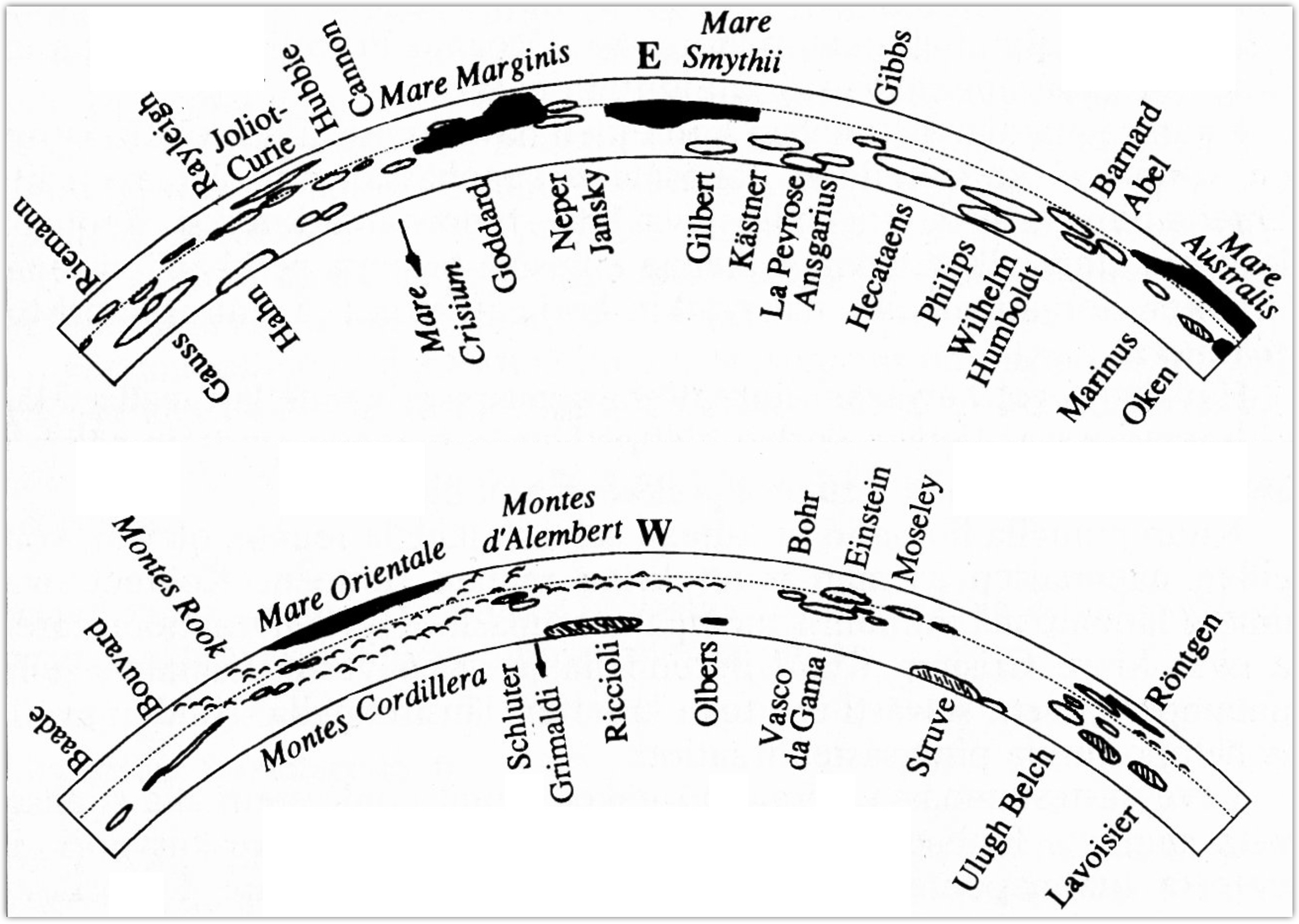 Kuva 7. Kuun itäisen ja läntisen reuna-alueiden kartta. Normaali Kuun kiekon reuna (pituusaste 90°) on merkitty karttaan pisteviivalla. Kartta: Veikko Mäkelä / Tähtitieteen harrastajan käsikirja 4.