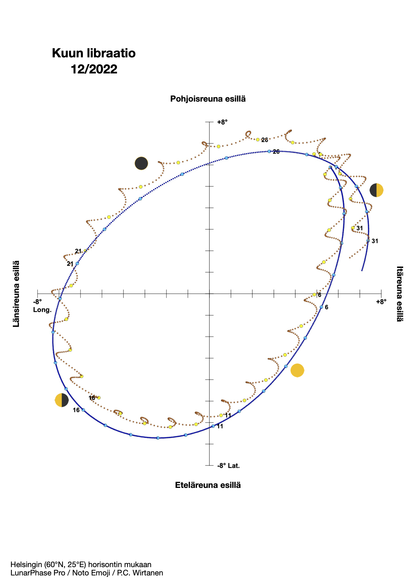 Kuva 12. Libraatiokaavio joulukuulta 2022. Sininen pisteviiva kertoo geosentrisen (maakeskisen) libraation, vaaleanruskealla pisteviivalla on esitetty libraatio Helsingin horisontin mukaan. Kaavio: LunarPhase Pro / Noto Emoji / P.C. Wirtanen.