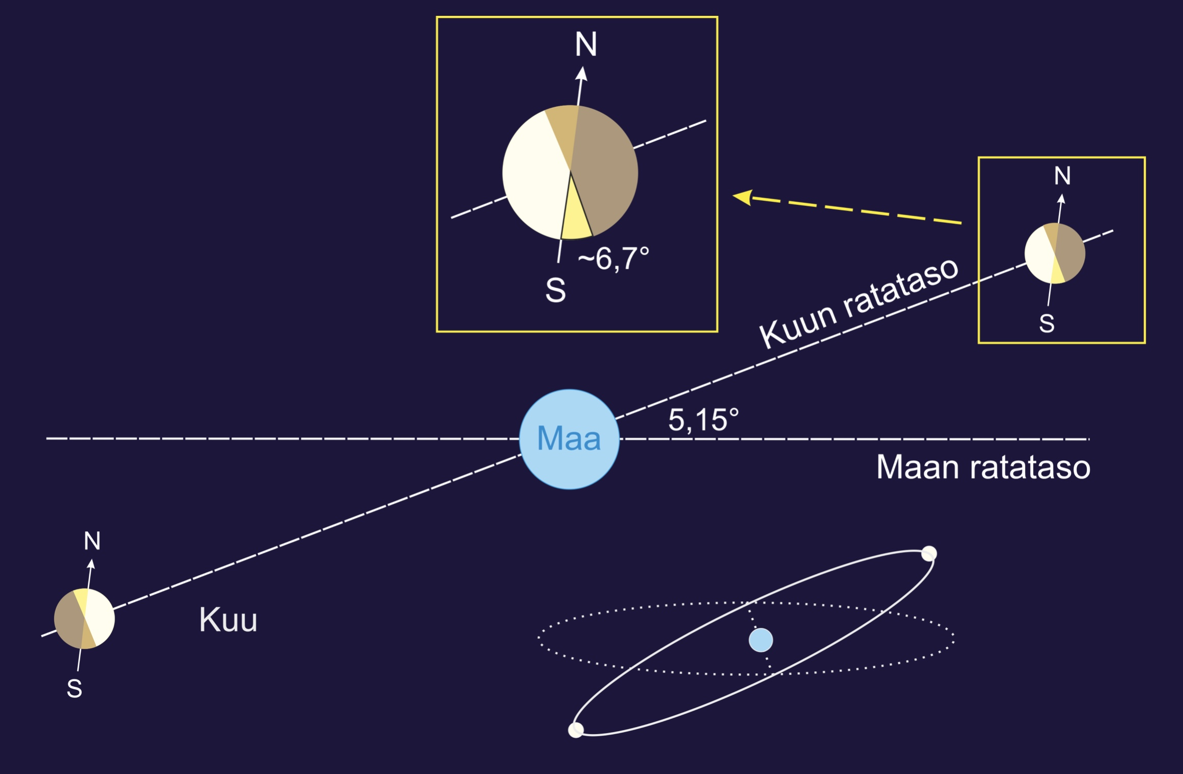 Kuvassa 2 Kuun pohjoisnapa on merkitty N-kirjaimella ja S on etelänapa. Kun Kuu on ratansa korkeimmassa pisteessä (ekliptikan pohjoispuolella), on etelänapa kääntynyt Maahan päin. Vastaavasti ratansa alimmassa pisteessä (ekliptikan eteläpuolella) näemme pohjoisnavan ympäristöä.