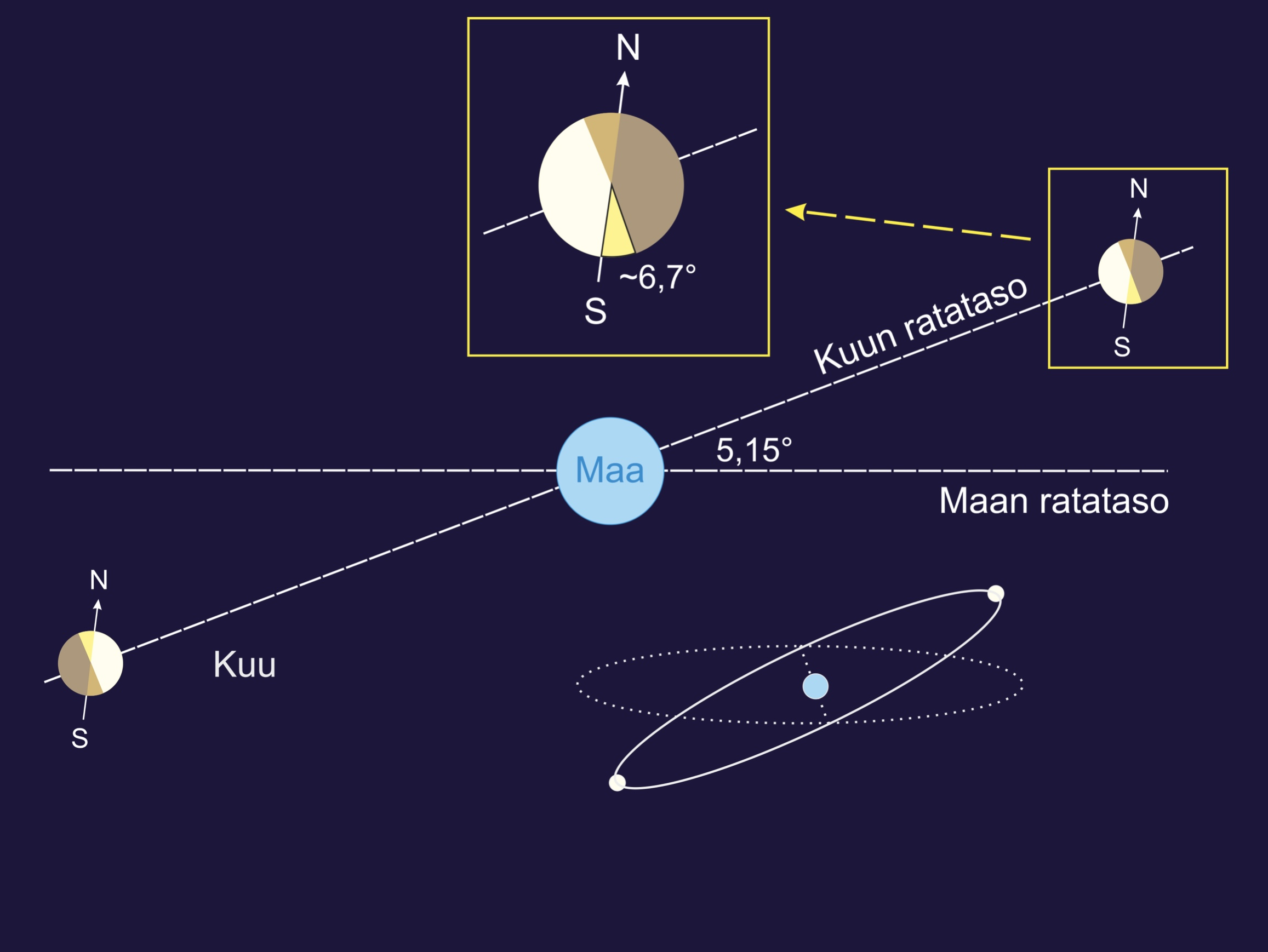 Kuun akselin poikkeama sen ratatasosta on 6,7°. Tämä mahdollistaa sen, että voimme kurkkia etäpuolta myös Kuun etelä- ja pohjoisnavan ympäristöstä.