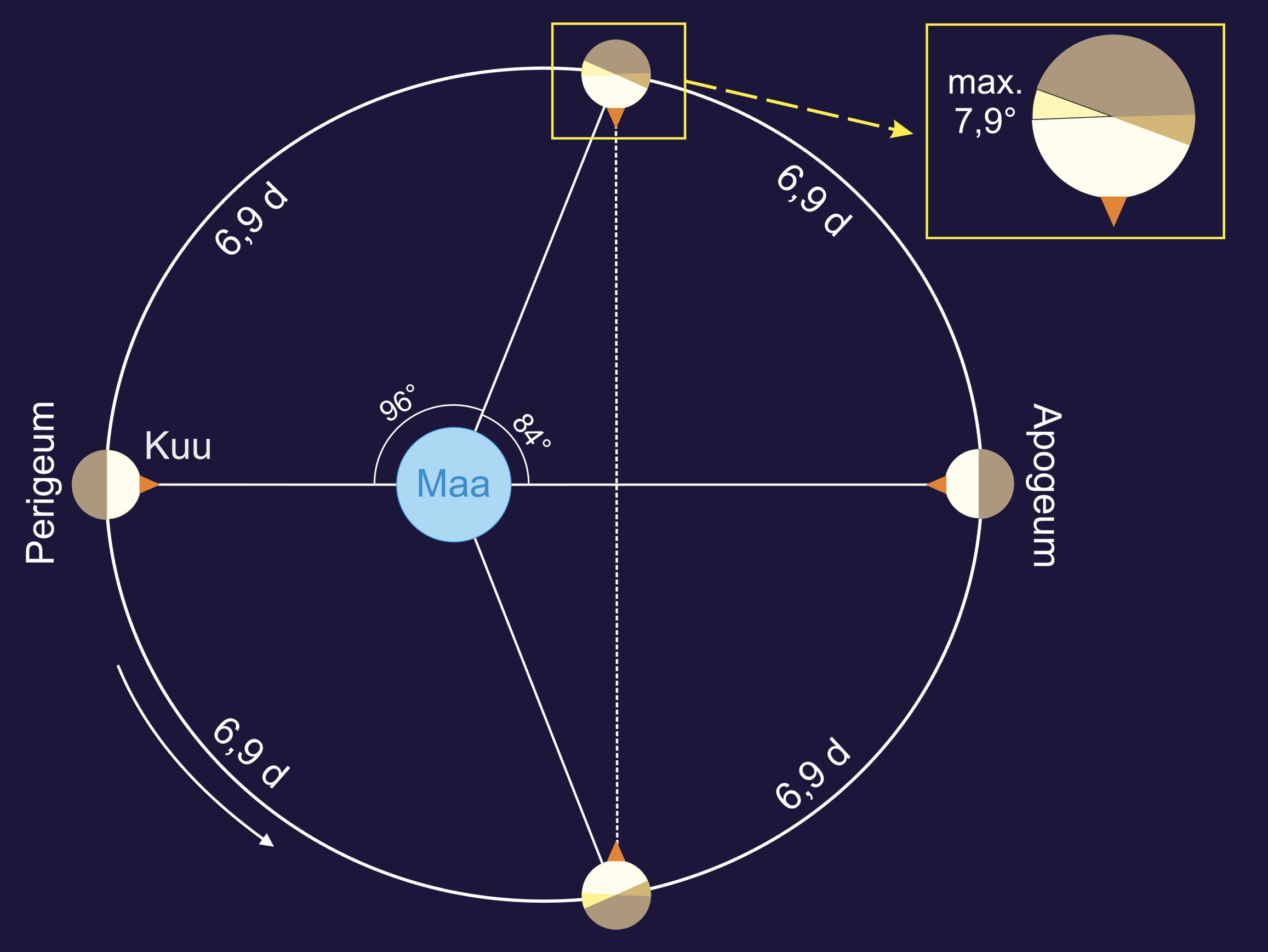 Kuvassa 1 näemme kaavion Kuun radasta. Se on jaettu neljään noin viikon mittaiseen sektoriin. Kun Kuu on lähellä perigeumiaan (lähimpänä Maata) on sen ratanopeus suurimmillaan. Koska Kuun pyöriminen akselinsa ympäri pysyy koko ajan samana, jää pyöriminen näennäisesti jälkeen rataliikkeestä ja Kuu ehtii hieman pyörimisliikkeensä edelle. Tällöin näemme hieman enemmän Kuun oikeaa reunaa (itäinen libraatio).