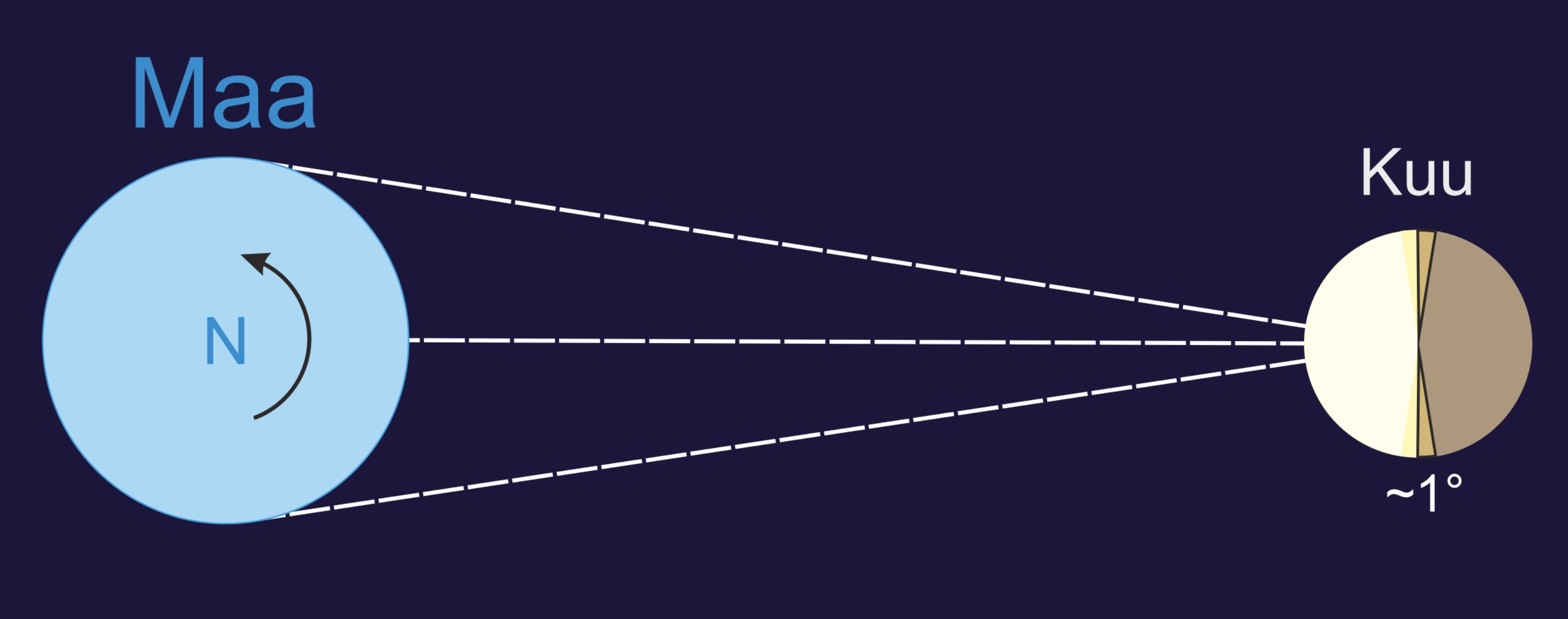 Kuun pyörähdysaika akselinsa ympäri, eli yksi Kuun vuorokausi, on sama kuin sen kiertoaika Maan ympäri. Tästä johtuu, että Kuu näyttää aina saman puolen meitä kohti. Tämä johtuu gravitaatiovoimien pyörimistä jarruttavasta vaikutuksesta. Sitä kutsutaan vuorovesilukkiutumiseksi tai synkroniseksi pyörimiseksi. Ilmiö on aurinkokunnassamme varsin tavallinen suhteellisen lähekkäin oleville kappaleille. Esimerkiksi Marsin pienet kuut samoin kuin jättiläisplaneettojemme suurimmat kuut kääntävät saman puolen keskusplaneettaansa kohti. Pluton ja Kharonin tapauksessa kummankin kappaleen pyöriminen on lukkiutunut toistensa suhteen eli ne molemmat kääntävät aina saman puolen toisiinsa päin.