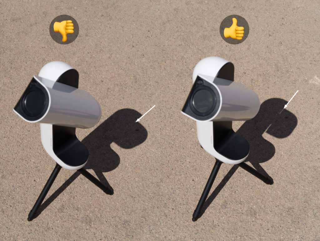 Vasen: Vespera ei ole oikein kohdistettu – Oikea: Auringonvalo kulkee käsivarren ja rungon välisen raon läpi on Vespera oikein suunnattu. Sopivasti sain kuvaan myös auringonpilkut.