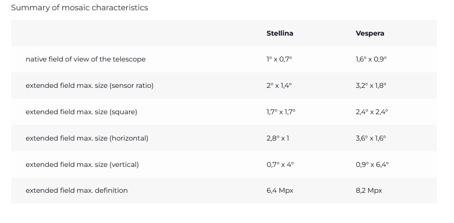 Vespera hyötyy mahdollisuudesta ottaa kuvia korkeammalla resoluutiolla kuin anturin resoluutio, jopa 8,2 megapikseliä mosaiikkitilan ansiosta. Kuvakentän Maksimi koko 3,2° x 1,8°