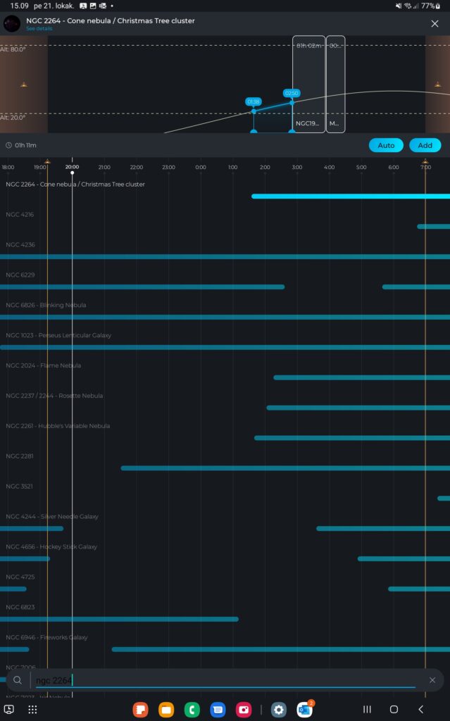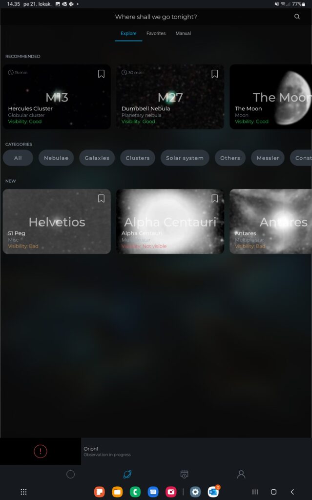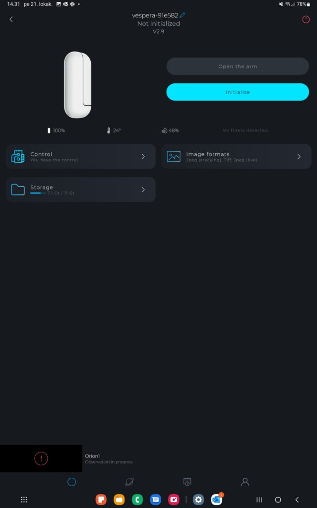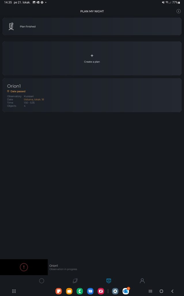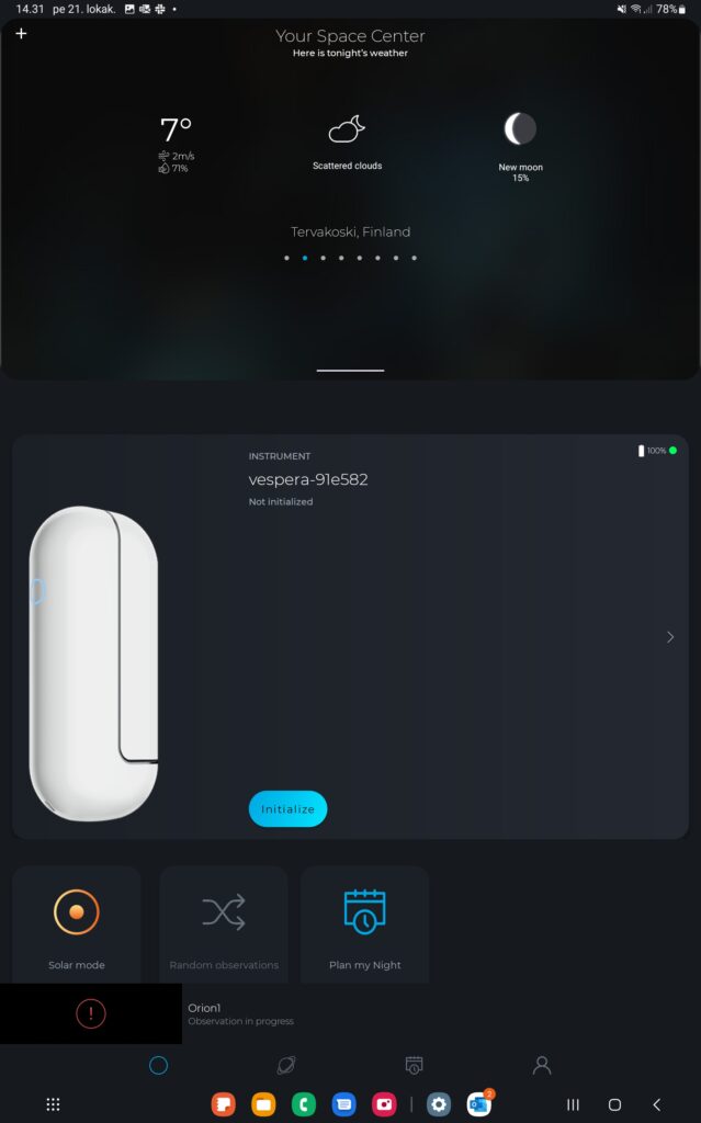 Kolmas välilehti on mielenkiintoinen: Suunnittele iltasi. Tästä voi jopa työnantaja kiittää. Tämä tarkoittaa sitä, että voin illalla ohjelmoida kohteet valmiiksi, jättää Vesperan ulos ja mennä nukkumaan. Vespera hoitaa automaattisesti kohteesta toiseen siirtymisen, kohdistamisen ja kuvaamisen. Laite osaa jopa sulkea itsensä, jos tulee pilviä tai alkaa satamaan. Aamulla voi sitten hyvin nukutun yön jälkeen tarkistaa tulokset.