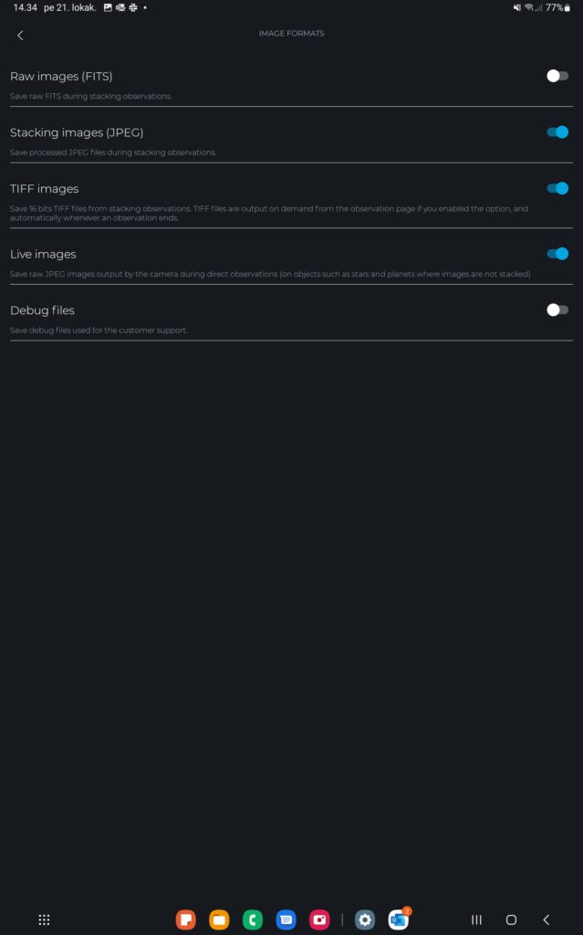 Vesperan ottamat kuvat voi tallentaa eri tiedostomuodoissa tai vaikka jokaisessa muodossa. Vaihtoehtoja ovat Jpeg, TIFF ja FITSS, ja näitä voi käsitellä manuaalisesti tai käyttää valmiiksi pinottuja kuvia.