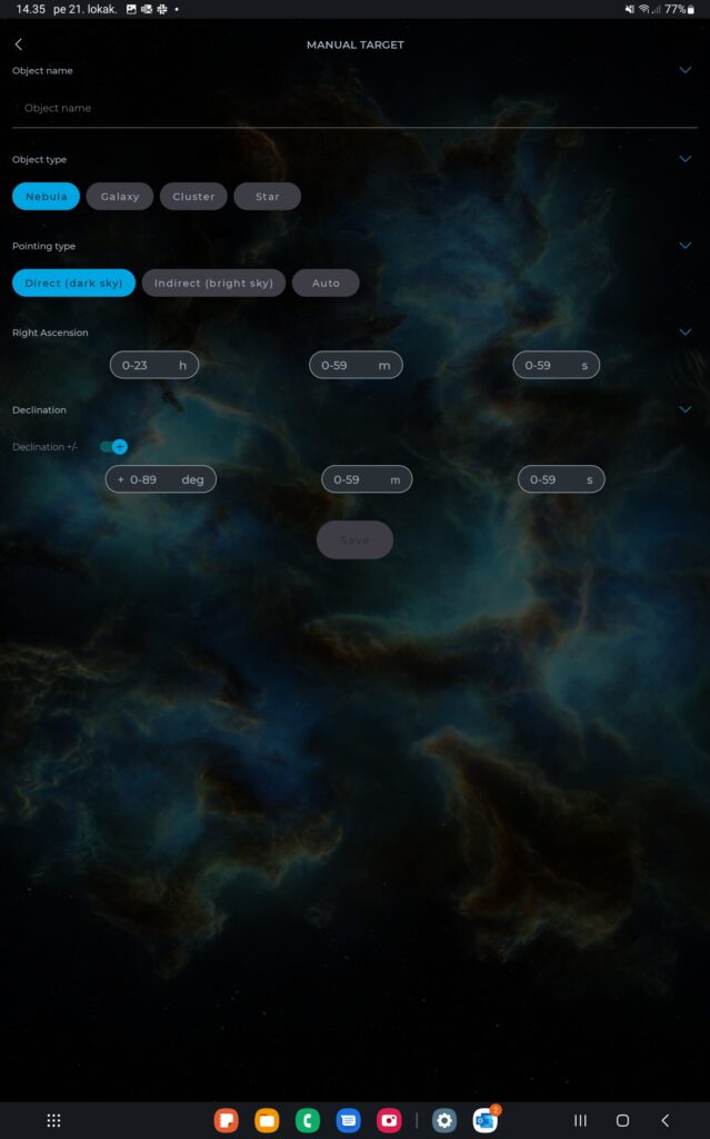 - Joysticilla ei voi liikkua vapaasti, vaan pitää manuaalisesti laittaa RA ja Dec kohteille, joita ei löydy luettelosta