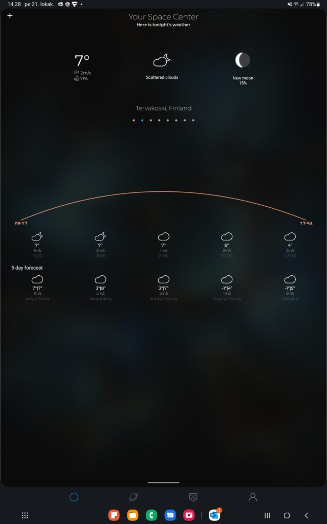Sivun yläreunassa näkyvät sääolosuhteet ja kuun vaiheet. Alas vedettäessä tulee näkyviin viiden päivän sääennuste sekä muita ajankohtaisia tähtitaivaan tapahtumia.