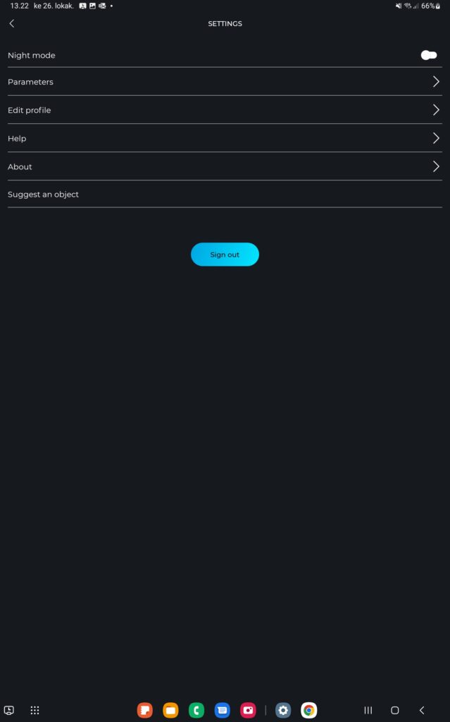 Yhdistän tabletin Vesperan Wifiin ja käynnistän tabletilta Singularity-sovelluksen. Sovelluksen kautta tapahtuu kaikki laitteen hallinta. Ensimmäisellä välilehdellä syötetään sijainti, joita voi olla useampi esim. koti, mökki tai vaikka tähtikallio.