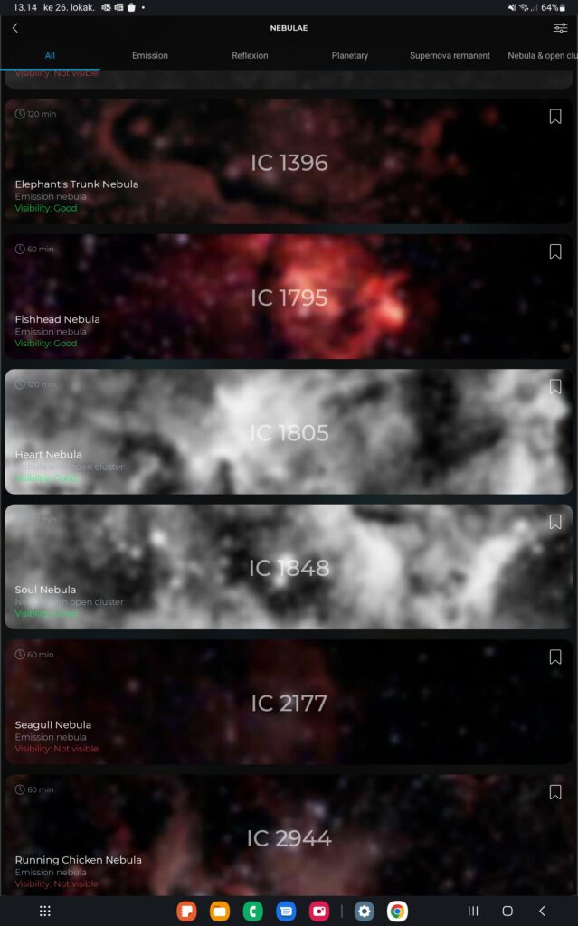 Toiselta välilehdeltä löytyy katalogi, jossa on ryhmiteltynä selkeästi sumut, galaksit, avoimet tähtijoukot, aurinkokunta, messierin kohteet ynnä muut.