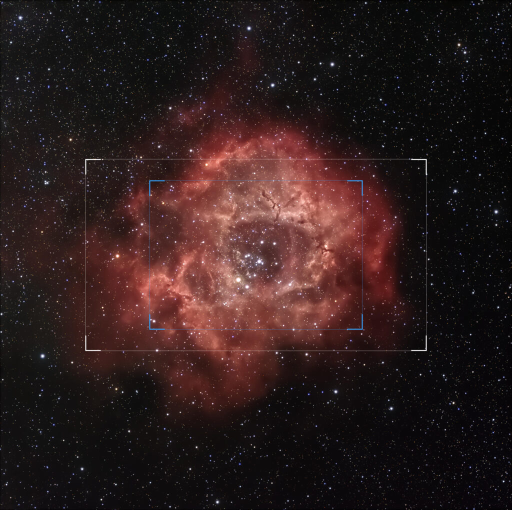 Rosette Nebula 2,5 tunnin integraatioajalla ja käsitelty Affinity Photo- ja Starnet ++ – sovelluksilla. Kuvan päälle asetetut kehykset edustavat Stellinan (sininen) ja Vesperan (valkoinen) alkuperäisiä kenttiä.