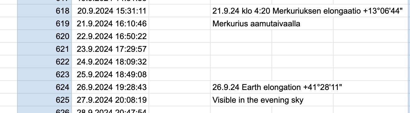 MarsExcel: Saalista Stellariumista. Kirjasin kiintoisia kohtaamisia, elongaatioita, jne. suoraan Exceliin (näköjään päivästä riippuen eri kielillä), jotta löytäisin tapahtumat myöhemmin uudelleen Stellariumista.