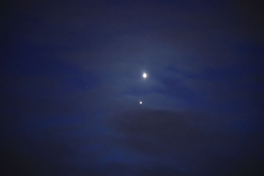 Kotona katsoin että koko taivas on pilvessä. Päätin kuitenkin ajella Turun Ruissaloon odottamaan ihmettä ja ihme tapahtui. Viitisen minuuttia sain katsella ja kuvata tätä Venuksen ja Jupiterin kohtaamista pilviraosta.