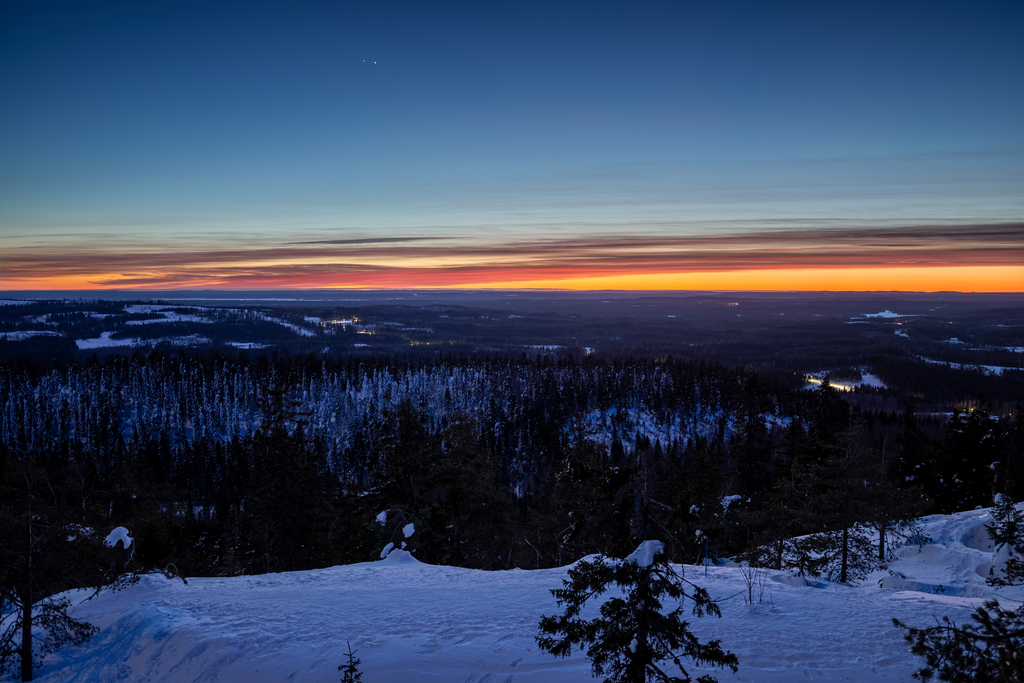 Kuvauspaikalle päästyäni totesin, että taitaa sadella hieman lunta joten ei niin hyvältä vaikuttanut. Kiipesin silti kukkulalle passiin. Olisin tietysti voinut yrittää hahmottaa pilvisyystilannetta netistä, mutta puhelin oli jäänyt kotiin. Ei auttanut kuin selvittää tilanteen kehitys empiirisesti..
