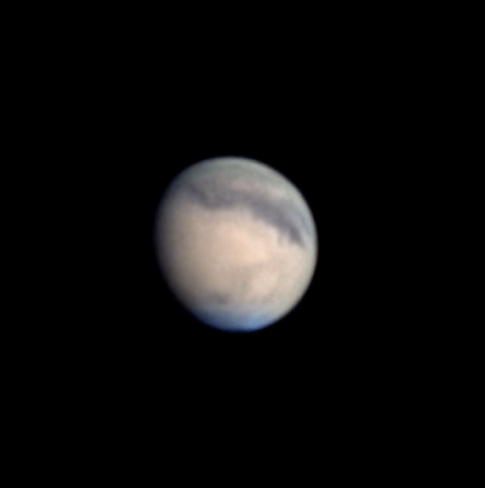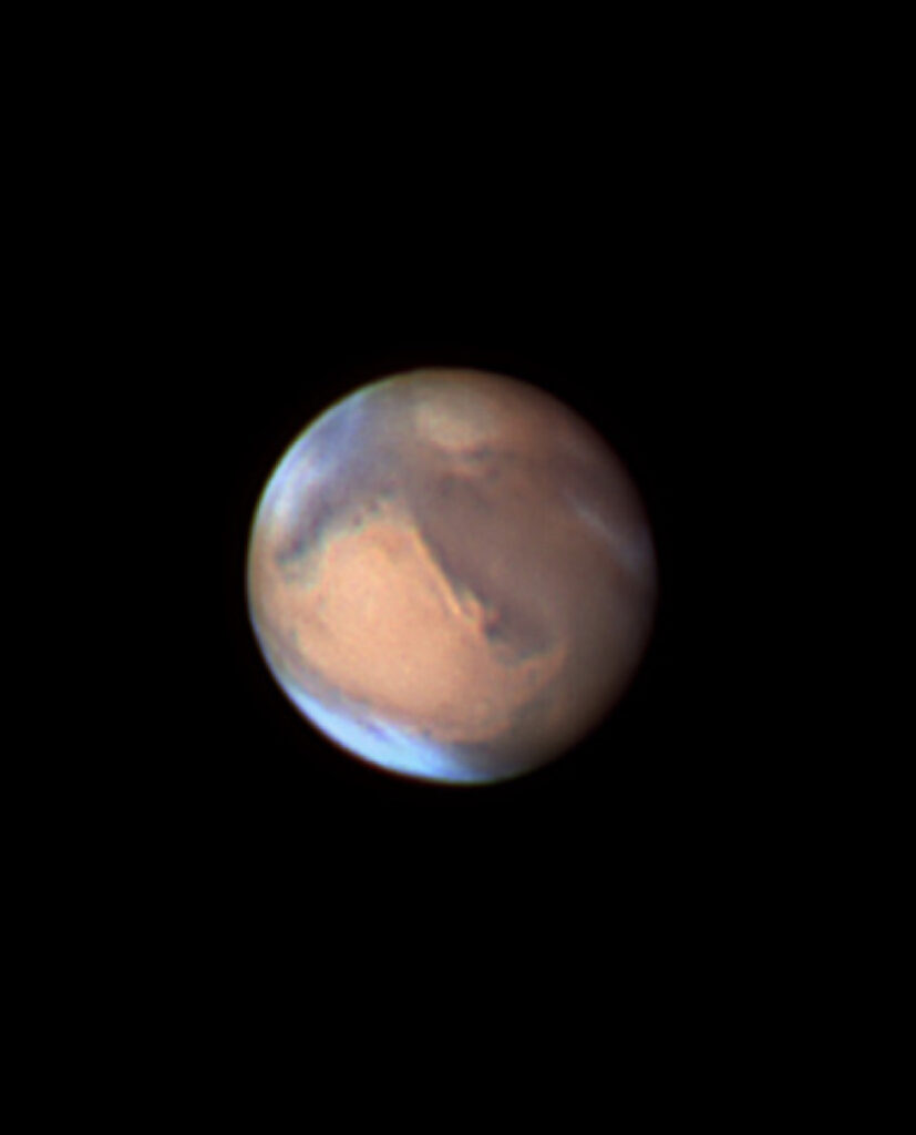 Kuva 16. Mars 26.1.2023 klo 20.31–20.40. CM = 359°, kulmaläpimitta 11,3”. Newton 600/2400, Powermate 2×,Paracorr 2, ASI 183MM, IR-RGB. Kuva: Ari Haavisto.