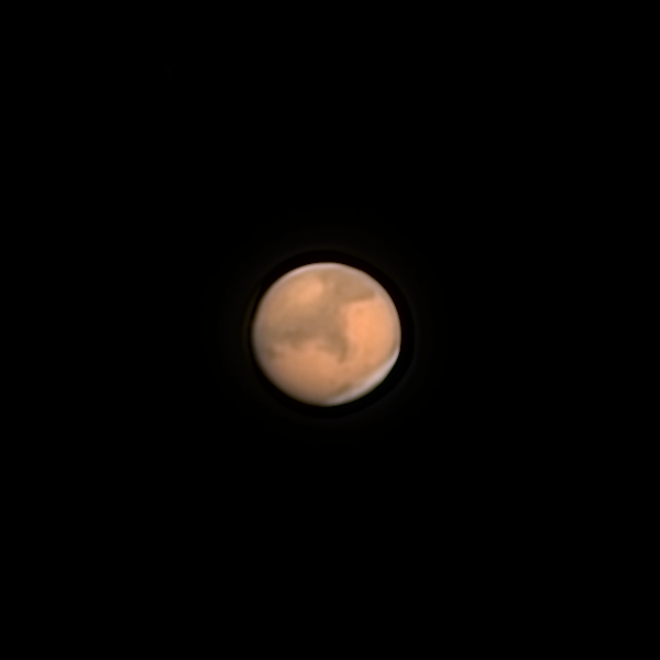 “Ensimmäinen visuaalihavaintoni Marsista sitten opposition 2020. Marsin kulmaläpimitta oli vielä pieni (havainnon hetkellä noin 13,1″), mutta Ulvilan tähtitornin Celestronilla (280/2800 mm) erottui silti jo kohtalaisesti yksityiskohtia, vaikka seeing oli vain keskinkertainen ja Mars vain 17 asteen korkeudella.