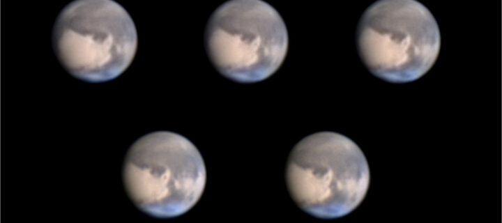 Kuva 14. Mars 12./13.11.2022 klo 23.24-0.33. CM = 350°, 354°, 357°, 5,4° ja 6,6°; kulmaläpimitta 16,3”. CPC 1100, X-Cel 2×, Neptune-C II (IR), ASI 224MC (RGB), IR-Pass 807 nm, IR/UV-poistosuodatin. Kuva: Lasse Ekblom.
