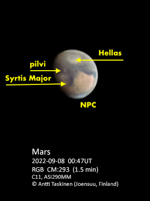 Although Finnish observers made quite limited number of observations due to weather conditions, the quality isgood. Hellas Planitia was notability bright in this apparition from the first observations on the end of July (images 5 and 6). In Antti Taskinen’s image (5) there is also bright white cloud near Syrtis Major.