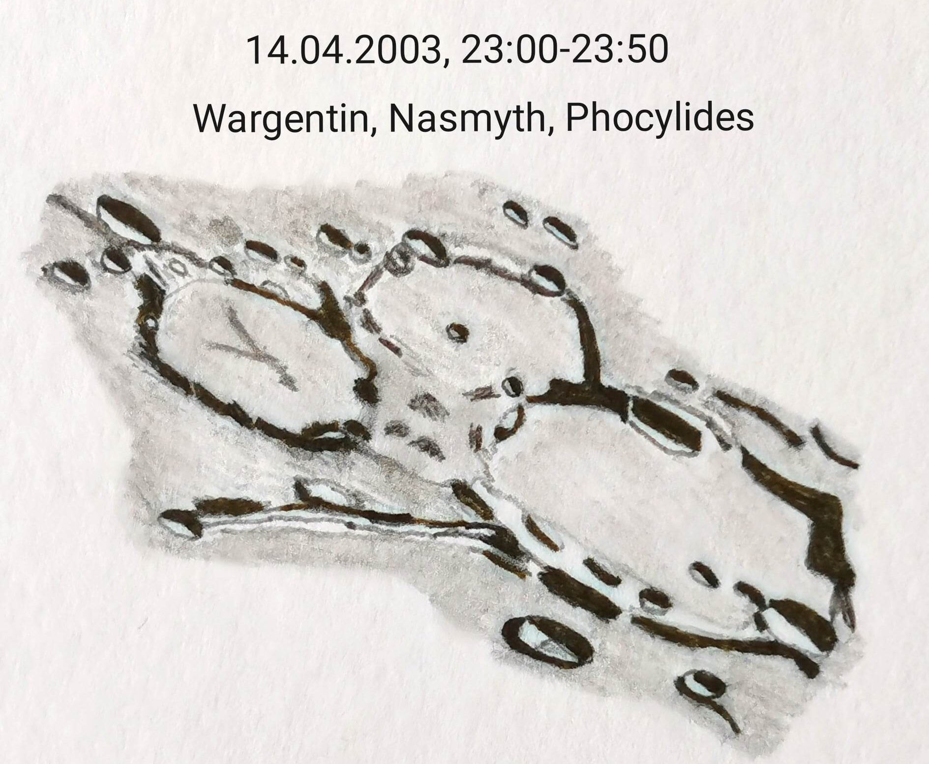 Kuva 11. Wargentin, Nasmyth ja Phocylides 14.4.2003 klo 23.00–23.50. RF102/1000, 5 mm (200×). Kuva: Jari Kuula.