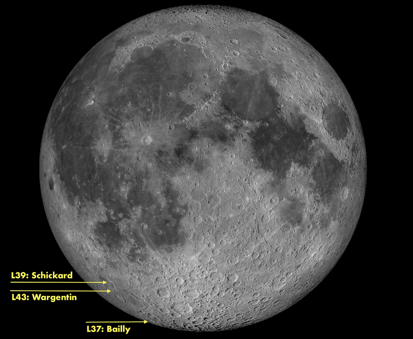 Kuva 1. Bailly, Schickard ja Wargentin sijaitsevat Kuun lounaisella reunalla. Kartta: Virtual Moon Atlas / LRO WAC / P.C. Wirtanen. Napsauttamalla saat artikkelin kuvat ja kartat suuremmiksi.