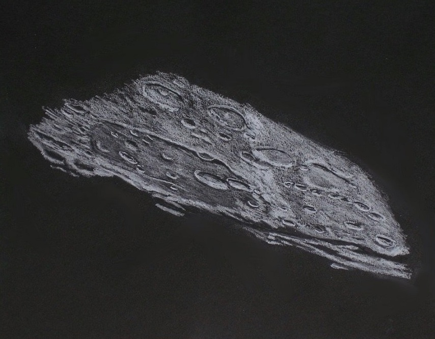 Kuva 5. Bailly 9.2.2023 klo 4.15–5.40 (Suomen aikaa). 16” Dobson, 8 mm (224×). Piirros tehty mustalle Strathmore 400 Artagain -paperille Conté-pastellikynillä. Piirros: Frank McCabe.