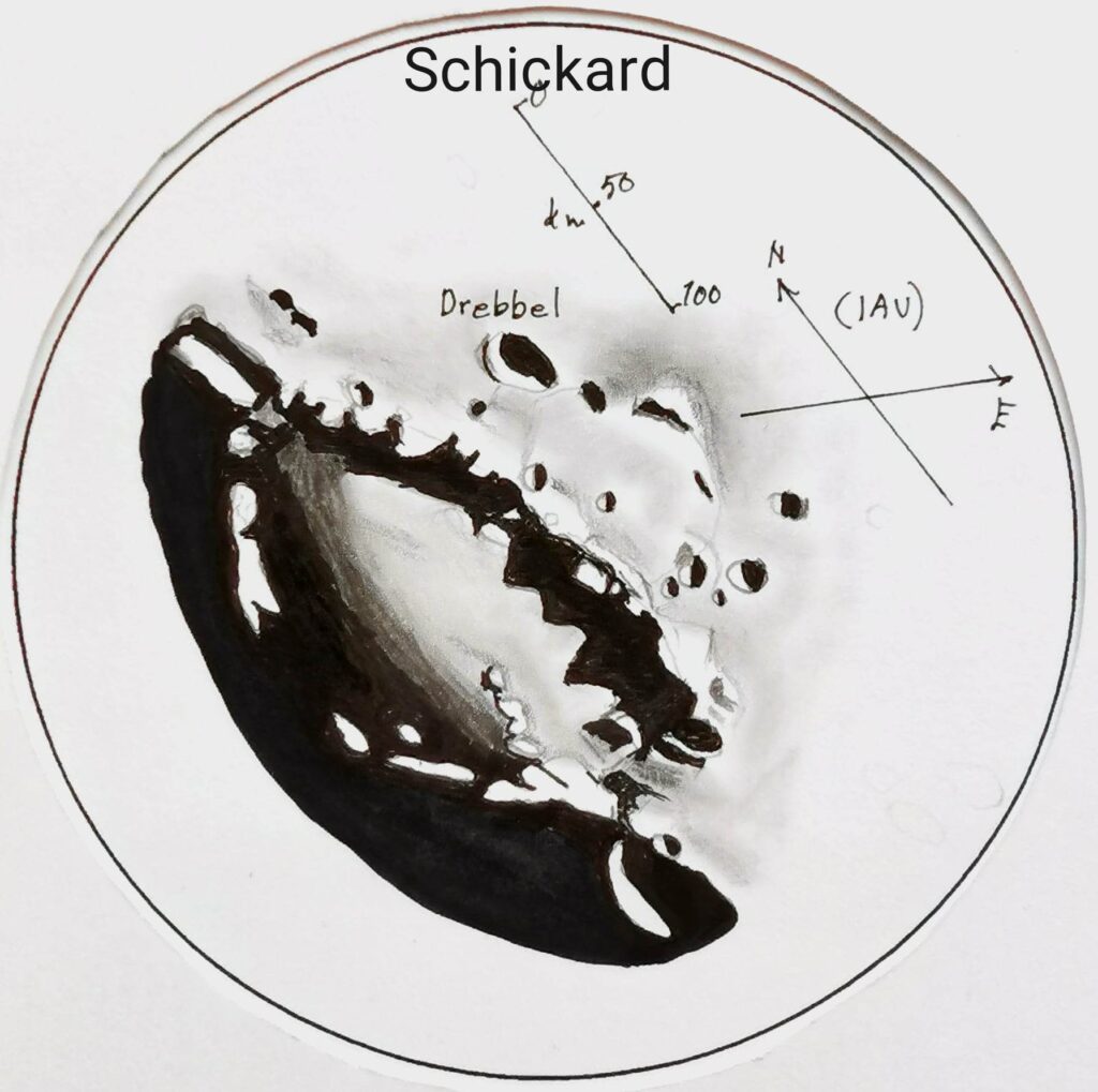 Kuva 7. Schickard 3.4.2023 klo 22.30–0.00 Suomen aikaa. 30 cm Dobson, 240×, ND-suodin. Kuva: Jef de Wit, Hove, Belgia.