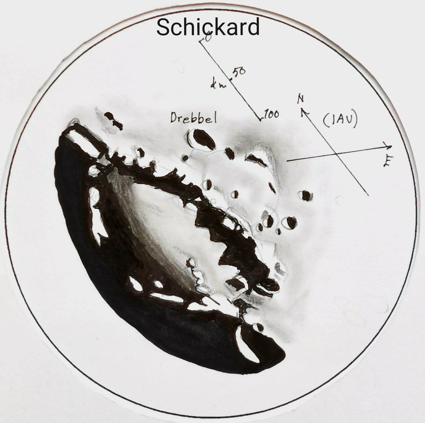 Schickard on sekin huomattavan suuri kraatteri. Kolme suurinta virallisesti nimettyä lähipuolen kraatteria tulikin jo mainittua artikkelin alkupuolella. Tässä on neljänneksi suurin: Schickardin läpimitta on 212 kilometriä ja syvyyttäkin löytyy kolmisen kilometriä. Tässäkin on kyseessä varsin vanha vallitasanko, se on esinektariselta kaudelta eli Baillya vanhempi yli neljän miljardin vuoden takaa.