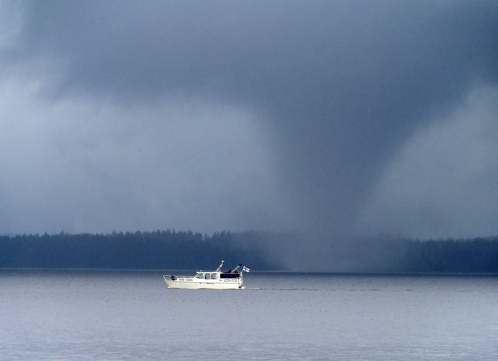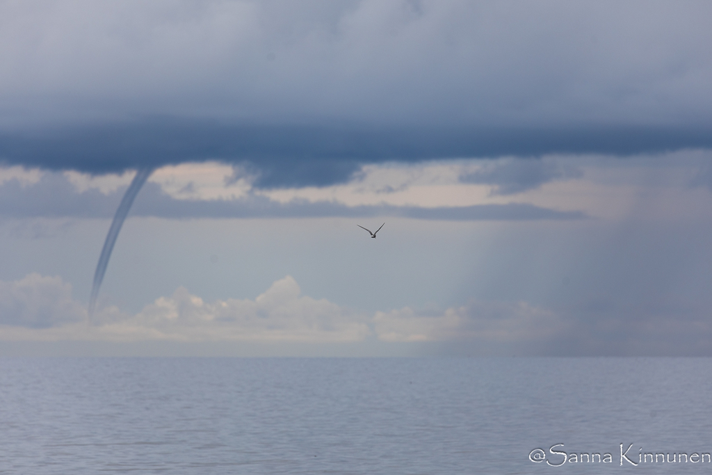 Myrskyilmiöitä saatiin lehdelle runsaasti. Kaikki eivät olleet suoraan ukkosiin liittyviä. Sanna Kinnunen kuvasi monen myrskybongarin unelmakohteen, vesipatsaan.