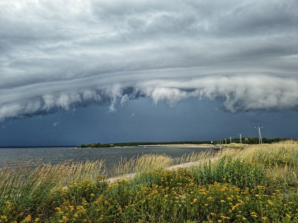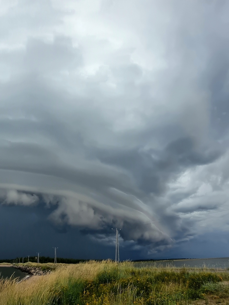 Kaakosta lähestyi ukkosrintama, jonka alareunassa näkyi vaakatasossa vyörypilviä. Ne rullasivat ja erkanivat välillä hieman toisistaan. Näiden pilvien alla koko rintamsn pituudelta oli tupsuina roikkuvia pilviä.