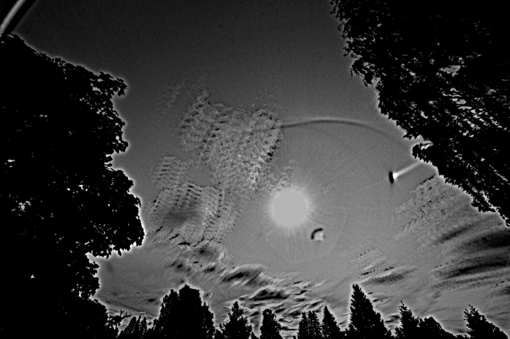 Oli syyskuun seitsämäs päivä. Kuulin NH90:n menevän läheltä ja singahdin parvekkeelle kameran kanssa. Koptereita oli itse asiassa kaksikin mutta sillä hetkellä ne olivat näkymättömissä. Taivaalla häämötti hieman 22 asteen rengasta ja ajattelin että nythän voisikin saada halo/heko-yhteispotretin. Koptereita ilmaantui lisää, kaksi kpl NH90 ja 2 kpl MD500 pörräsivät ympyröitä Myllykosken yllä. Vaihdoin hetkeksi pidemmän putkeen, mutta vain hetkesi sillä huomasin että halorengas kirkastui ja ylläsivuavakin ilmestyi kirkkaahkona. Kaikkiaan noin parikymmentä minuuttia kopterit esiintyivät halojen kanssa kameralle ennekuin jättivat estradin ja veivät halot mennessään (tai niin luulin). Jätin kameran kuitenkin kuvaamaan, josko sieltä vielä jotain ilmaantuisi.