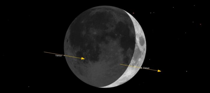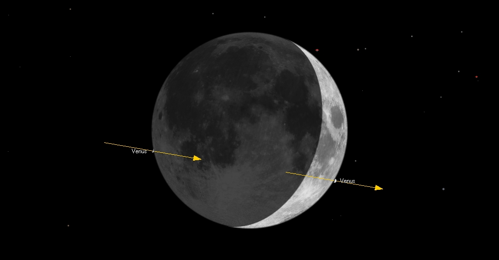 Venus peittyy Helsingissä Kuun taakse 9.11.2023. Venus peittyy klo 12.45 ja tulee esiin klo 14.00. Kuvassa pohjoinen on ylhäällä. Nuolten pituudet vastaavat Venuksen puolessa tunnissa kulkemaa matkaa. Kuvan muodosti Eric Limburgin laatima Lunar Occultation Workbench 4.1 -ohjelma.