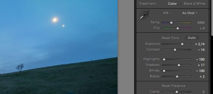 Kun tämä alivalottunut kuva sitten korjataan vastaamaan oikein valotettua, kirkkaat osat, kuten Kuu tai vaalea taivas, valottuvat lähes puhki.