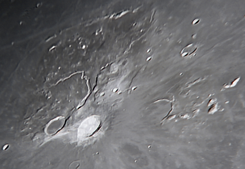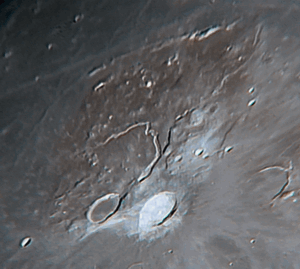 Aristarchus ja Vallis Schröteri olivat komeasti näytillä. Aristarchuksen ylänkö näyttäytyy putkellani minulle visuaalisesti hieman likaisen kellanruskeana. Väriero ei ole kovin voimakas, mutta kuitenkin selkeä verratessa ylänköä viereiseen mare-alueeseen. Parhaiten väri tulee visuaalisesti esiin pienehköä suurennosta käytettäessä.
