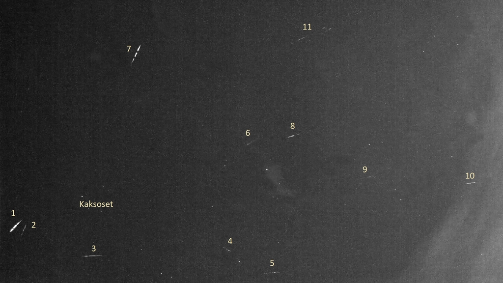 Itäkamera tallensi 8 erillistä meteoria puolen tunnin aikana. Kuvassa oik.yläreunassa Kaksosten tähdistön kirkas kaksikko.