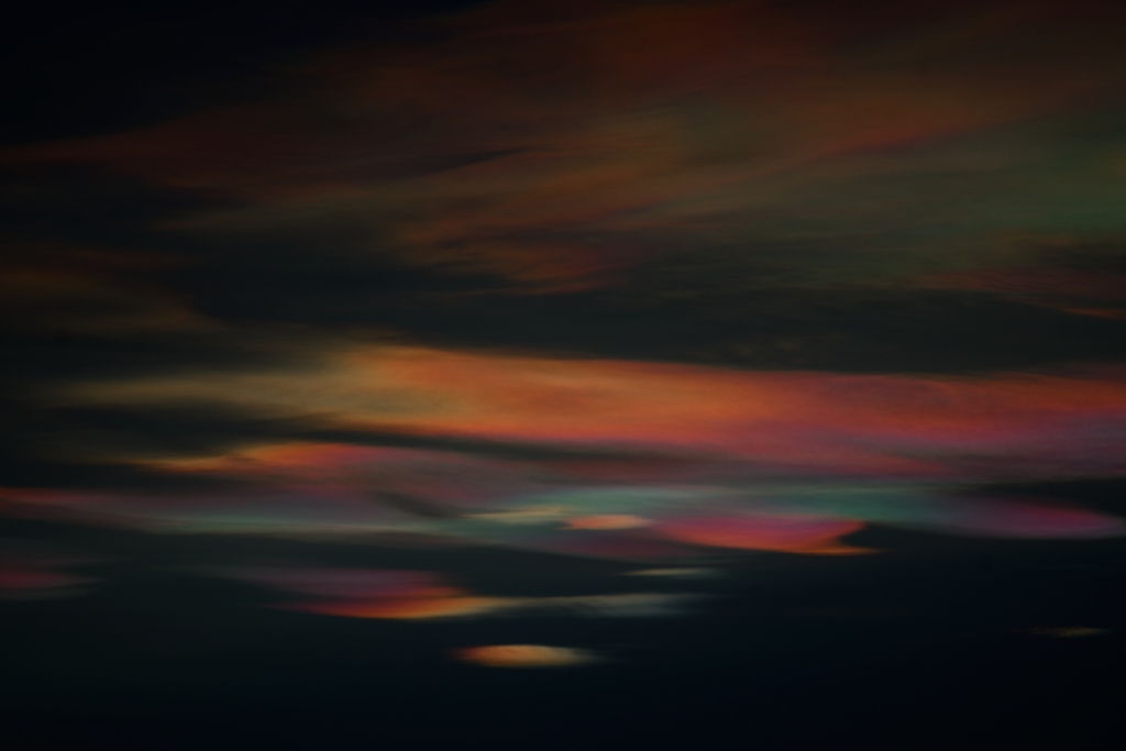 Kolmas huomio: liukuhihnalta syntyvää helmiäistä katsoessani olen huomaavinani, että värivyöhykkeiden liike tuntuu korreloivan “liukuhihnan” liikkeeseen. Ajattelen sen liittyvän pisarakokoon: sillä reunalla, missä pilveä “materialisoituu” esiin, pisarakoko on pieni ja keskellä pilveä pisarakoko on kasvanut ja toisella laidalla pisarat taas pienenevät ennen lopullista haihtumistaan. Ja värit vaihettuvat pisarakoon muutoksen mukaan. Vähän niinkuin saipuakuplan tai öljyläikän värit