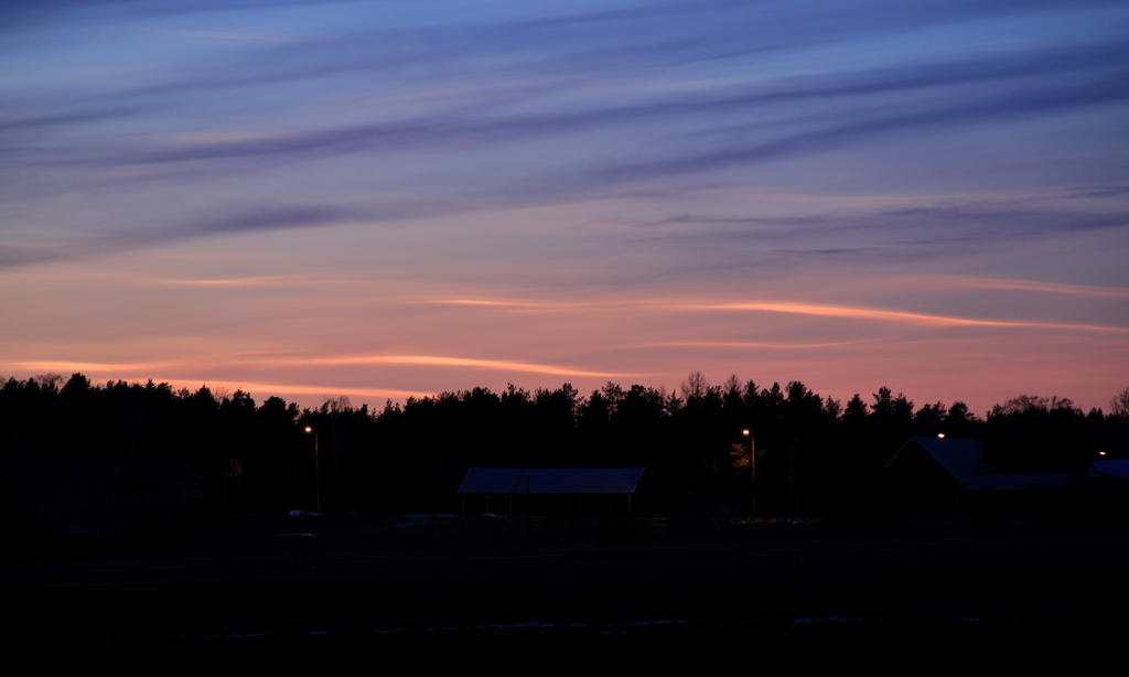 Helmiäispilviä hyvin matalalla luoteessa. Tällä kertaa taas tuollaisia yöpilvimäisiä vöitä. Auringon korkeus noin -5,5 astetta.
