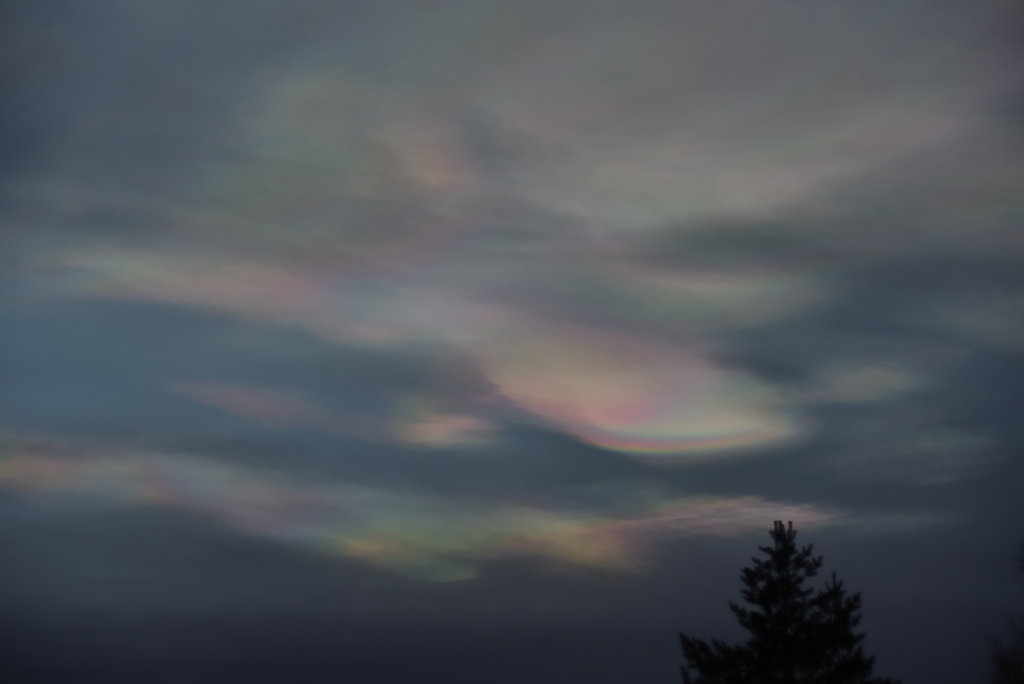 Matkan varrelta kuikuilin repsikan puolelta tilannetta ja yhtäkkiä äkkäsin komean värikkään helmiäispilven. Alapilvisyys olikin ohentunut! Näpsin kuvia minkä kykenin ja jännitin että kauanko näytöstä vielä kestää. Kestihän sitä: ylimääräinen koukkaus kaupalla ja sitten vielä vanhempien pihalta takaisin kaupalle kun oli toinen hanska hukassa. Hanska löytyi parkkipaikalta ja kun ehdin takaisin, näytös oli vielä voimissaan.